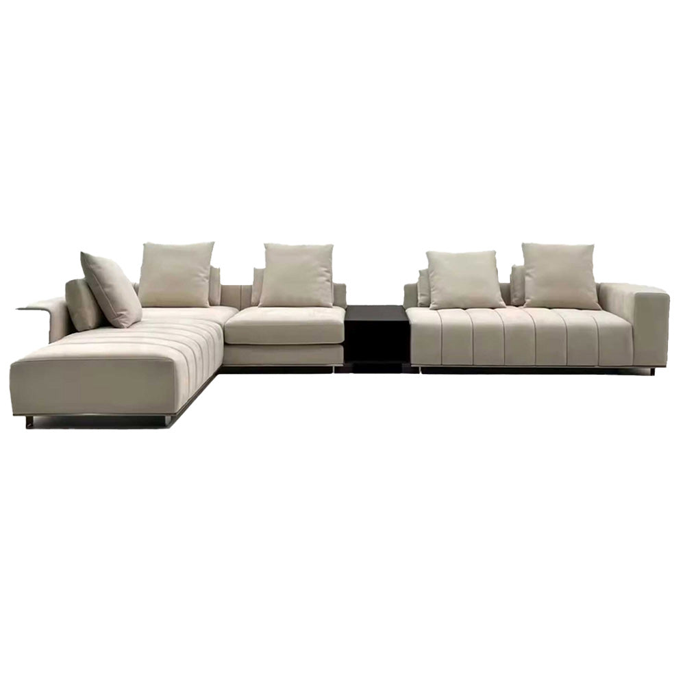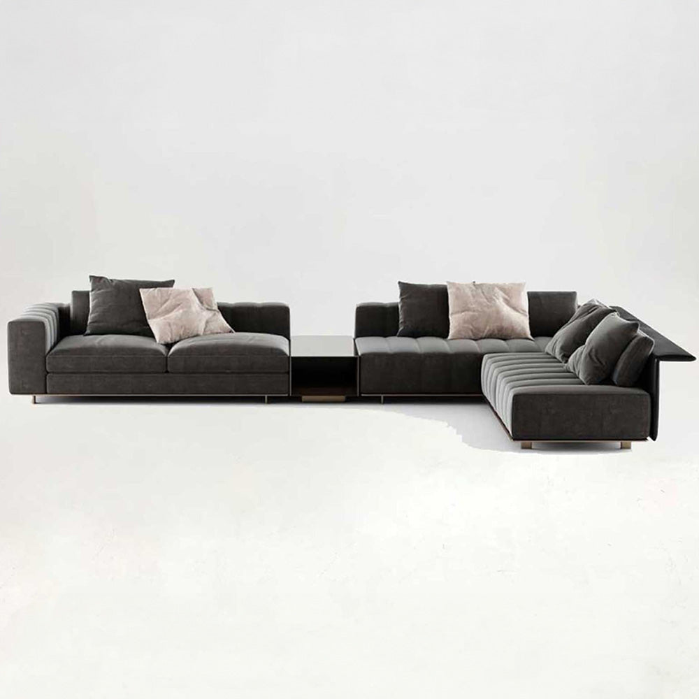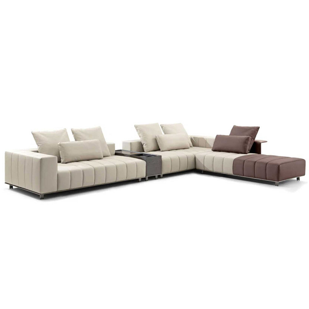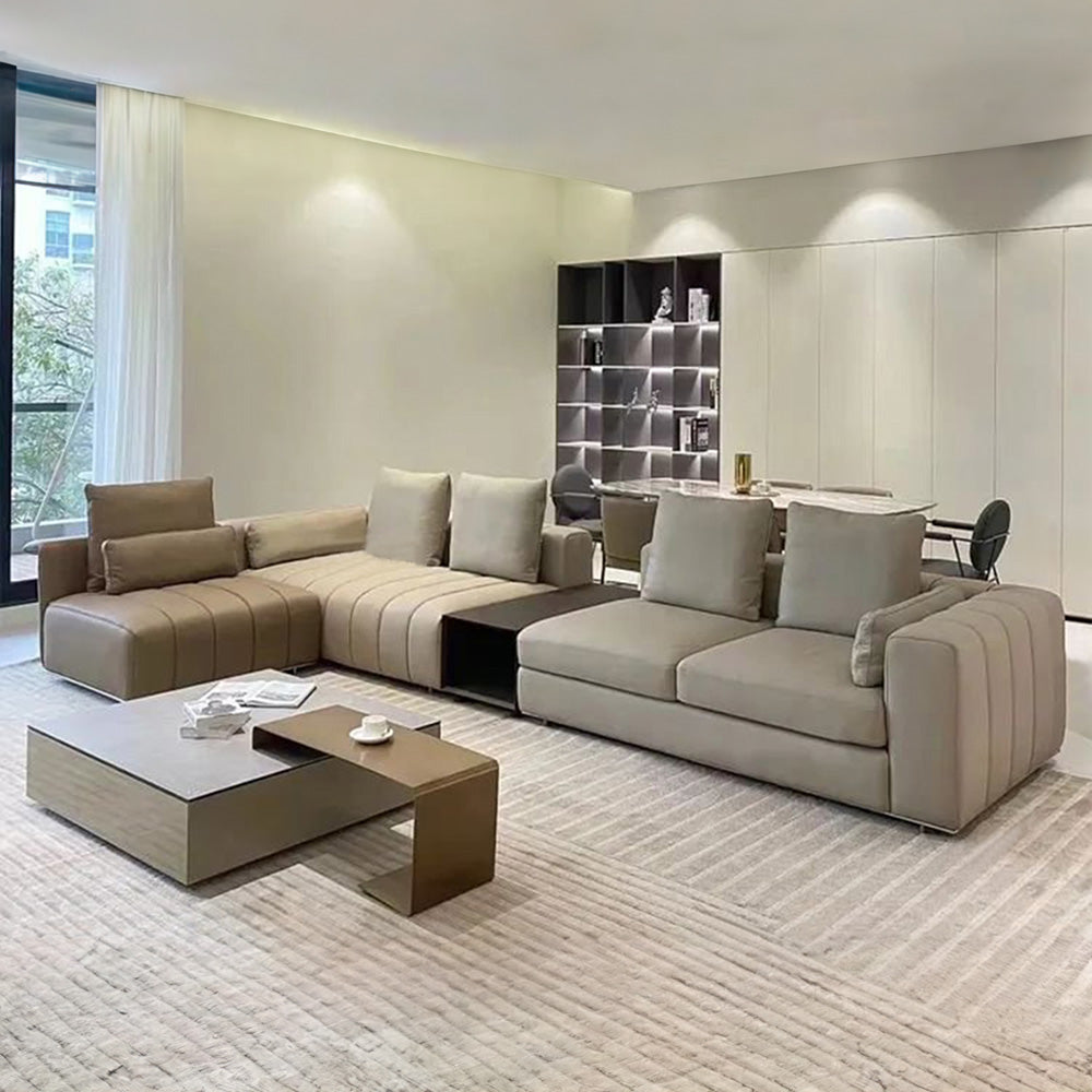 The Alexander sectional sofa combines modern design with exceptional functionality, making it a standout piece for any living space. Its modular structure allows for customizable configurations, adapting easily to different room layouts and seating needs. The sofa features generously padded cushions with refined stitching, ensuring superior comfort and elegance. Built-in elements such as storage compartments and sleek side tables add practicality without compromising its sophisticated appearance. The sofa's neutral tones are versatile, complementing a variety of interior styles, while optional contrasting sections provide a bold visual touch. Ideal for both casual lounging and hosting gatherings, the Alexander sofa offers ample seating and a contemporary aesthetic, making it a perfect choice for larger living areas seeking a blend of comfort and style.