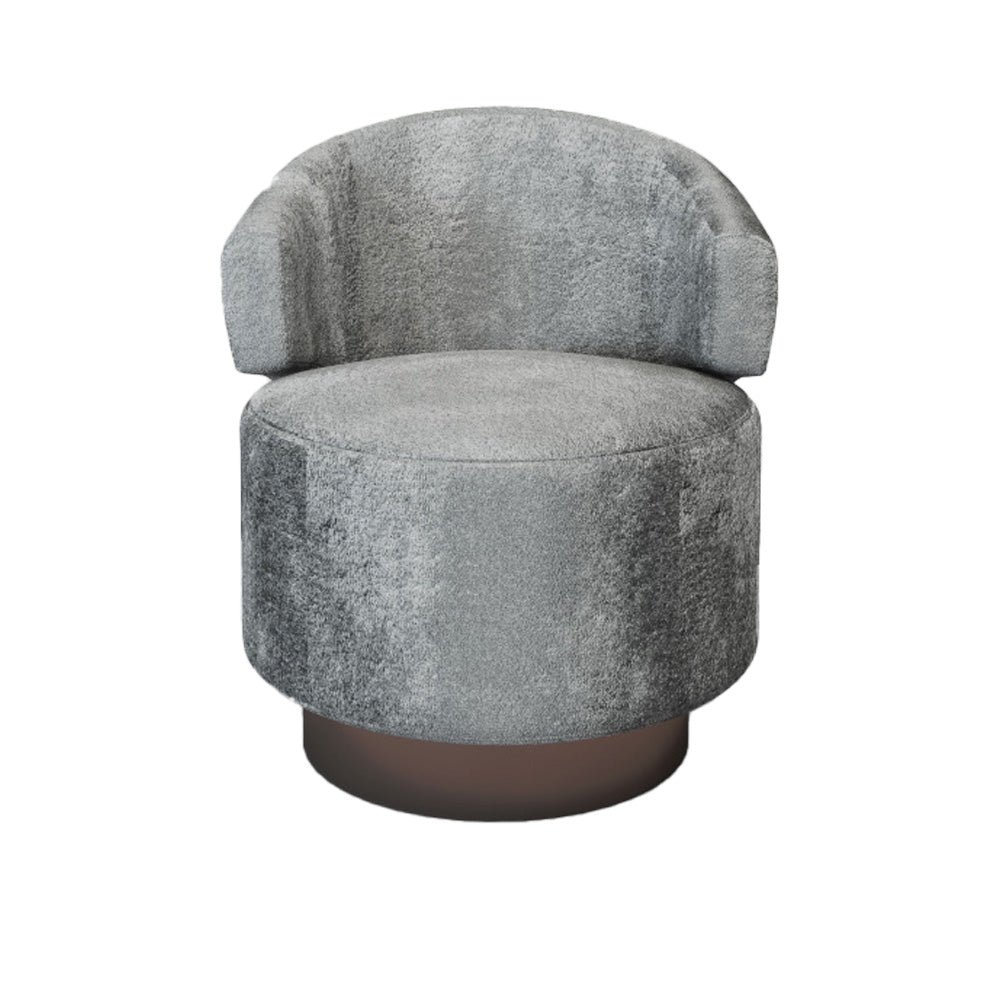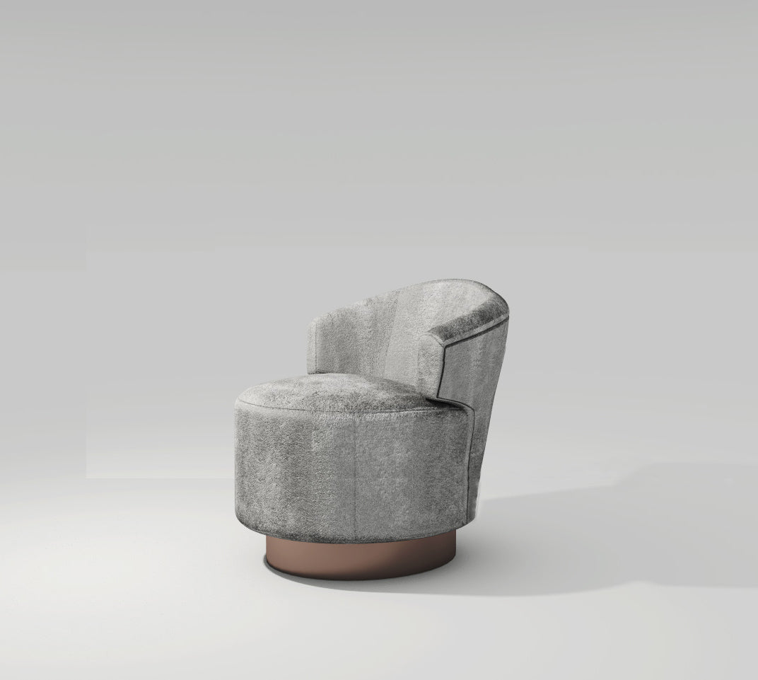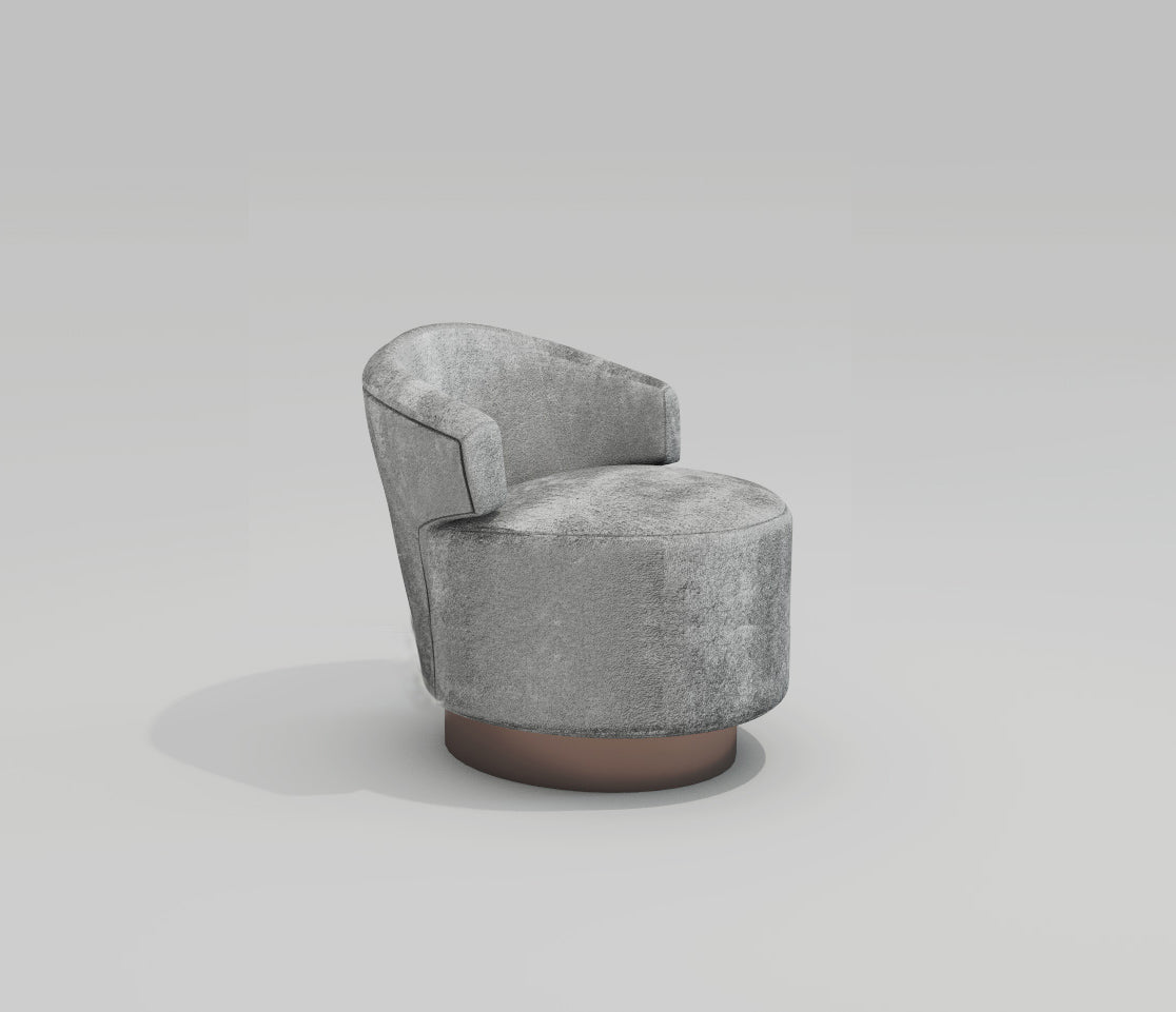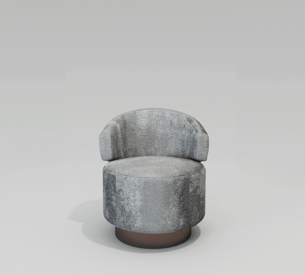 This beautiful velvet swivel chair reminds one of old Hollywood glamour. Its back is thick and plush with wraparound arms that gently hug. The round, tall seat is the largest feature of the chair and is complemented by a slightly narrower brown base. The silver-gray fabric is crush velvet. This gives the upholstery ever-changing highlights and low-lights. A chair like this is at home in a living room, office, study or bedroom. Its a brilliant piece for any corner of your home that needs a touch of luxury, but also needs to stay functional.