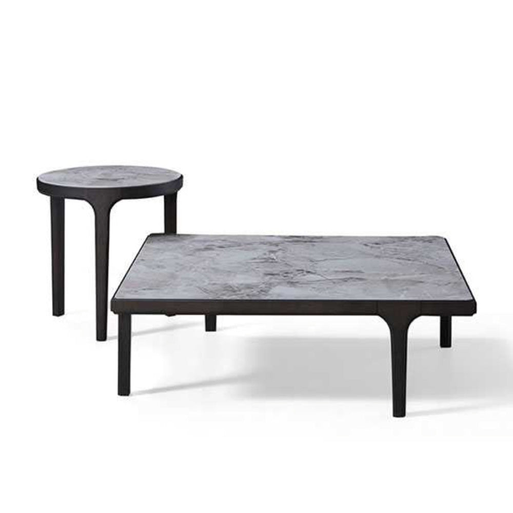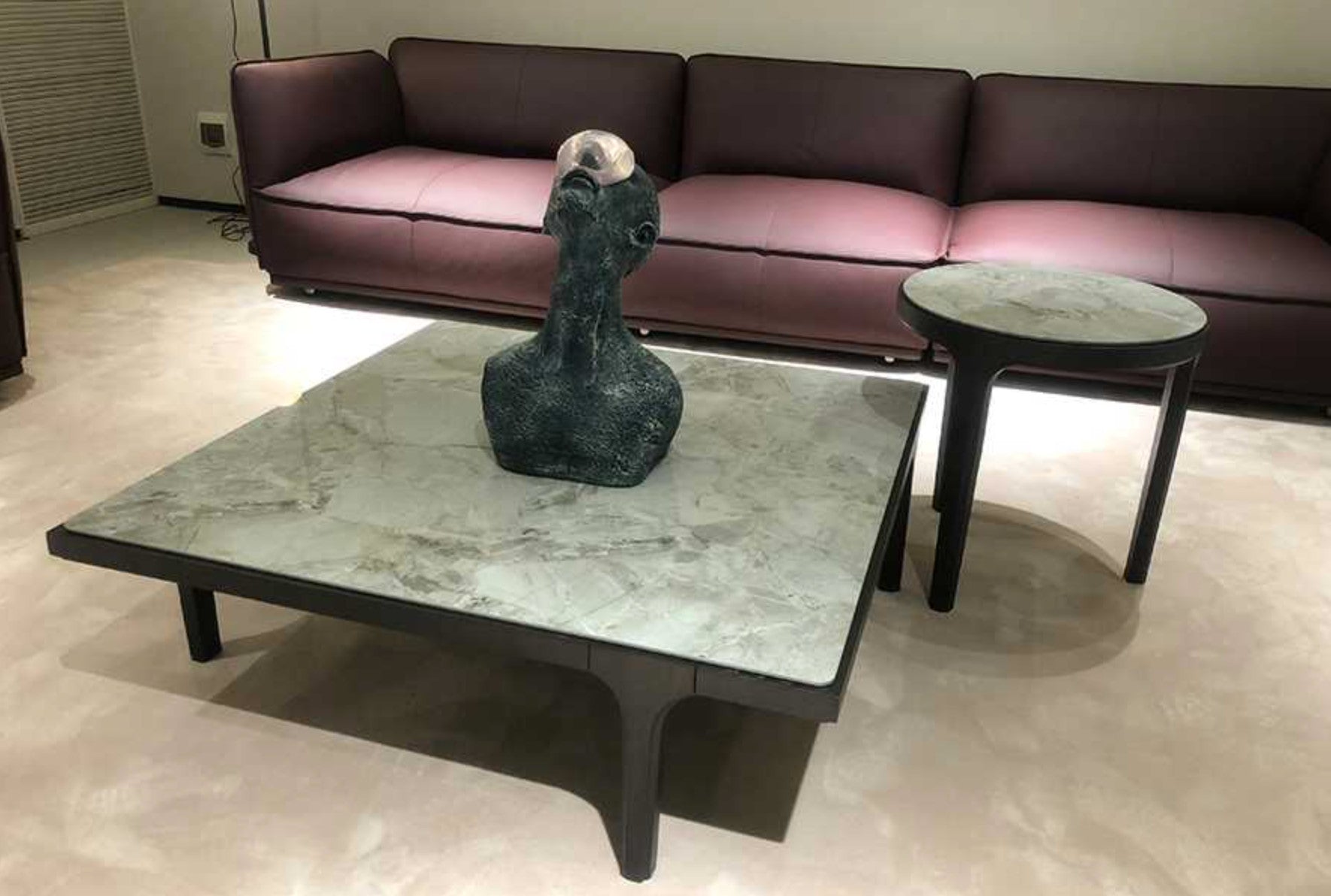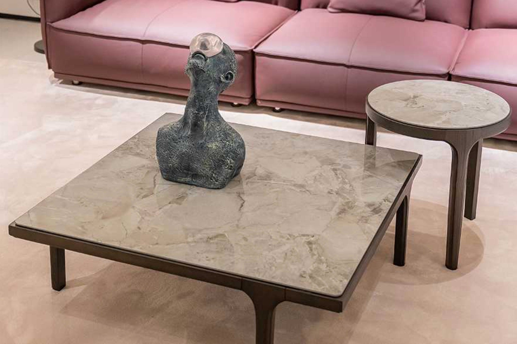 Hints of an Earthy decor style and inspiration from organic patterns are visible in the Aurelia Coffee Table Set that fuses well with modern and vintage interior styles. The fluctuating natural patterns of the matching marble tops hypnotize us with their dynamic forms. This effect is doubled by the combination of both tables, one large square, the other one pettite and round, which creates a fascinating contrast of forms that brings elegance to our homes or office spaces.