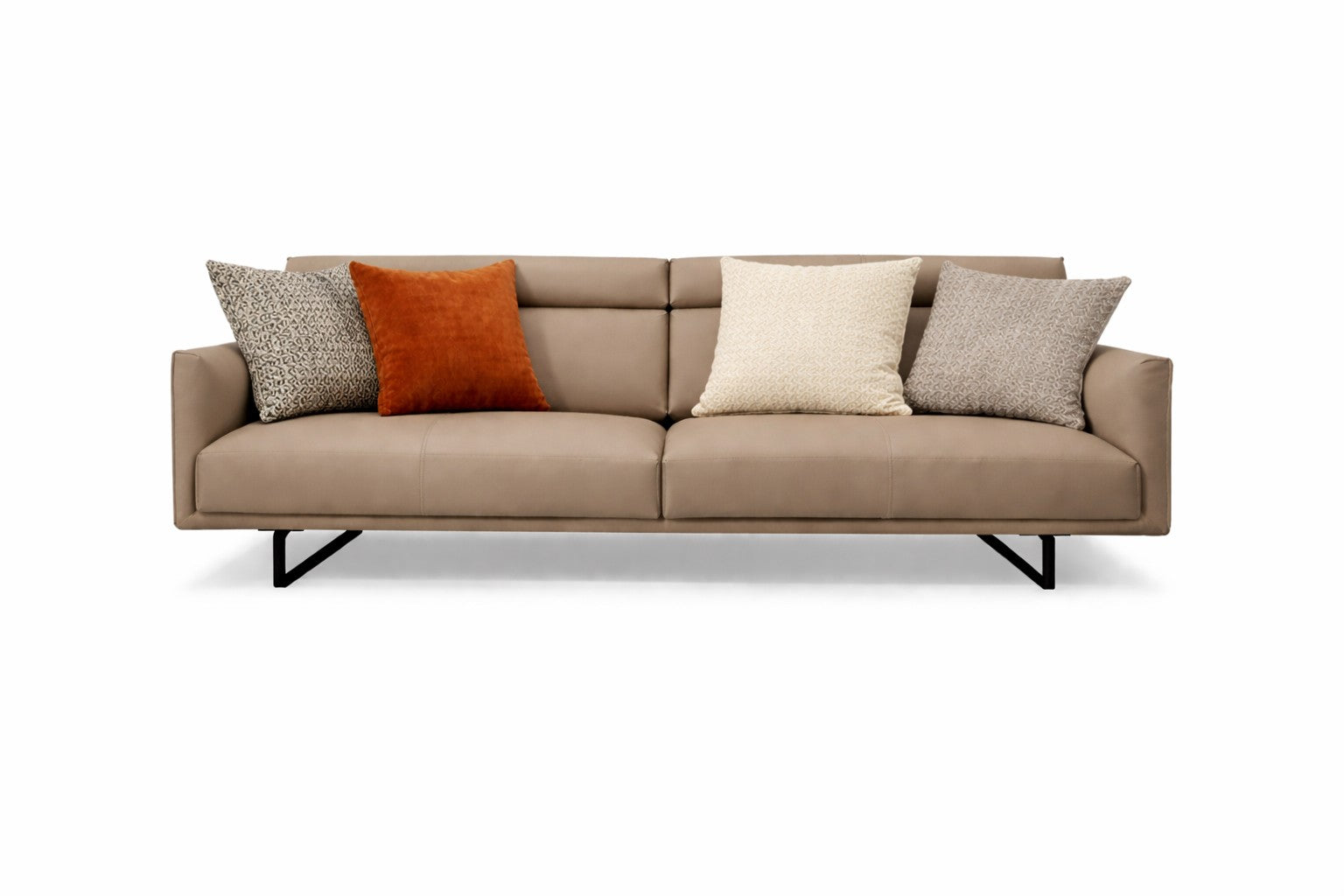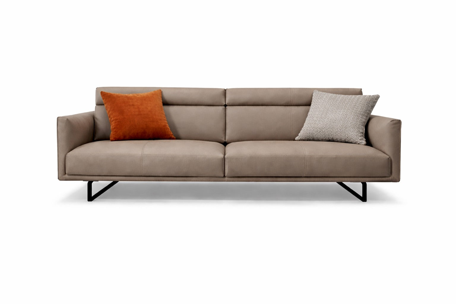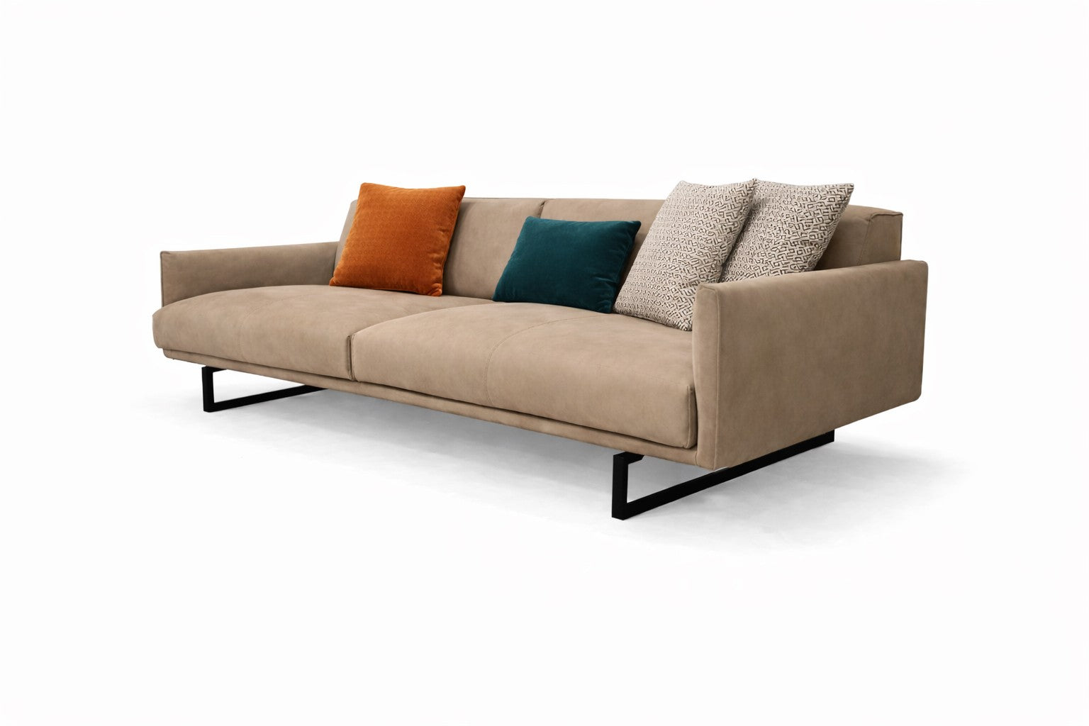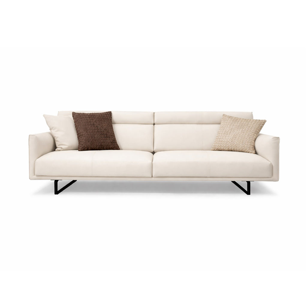 The three seater Azur sofa was built for those cozy afternoons of private laughter and comforting talks. Its compact form is held together by a metal base and covered in thick feather down cushions for long hours of seating. Additionally, the slim armrests and high backrest introduce a delicate touch that is further complemented by the slim, tall legs holding the piece above ground. Nonetheless, the sofa's greatest asset is its sliding seat function that enhances your experience with extra room to lie down during movie nights or to take a refreshing nap.