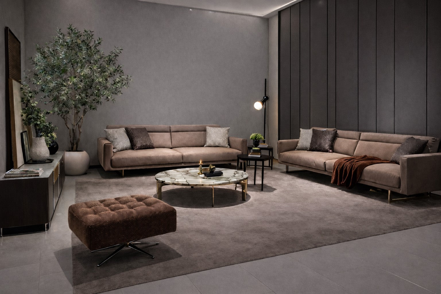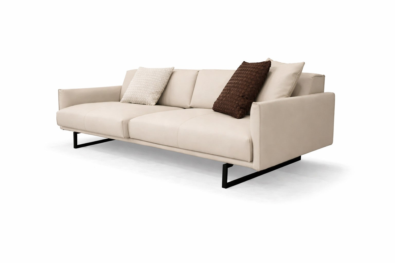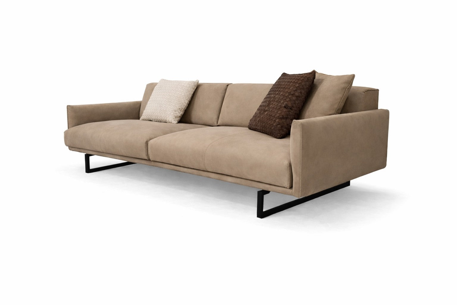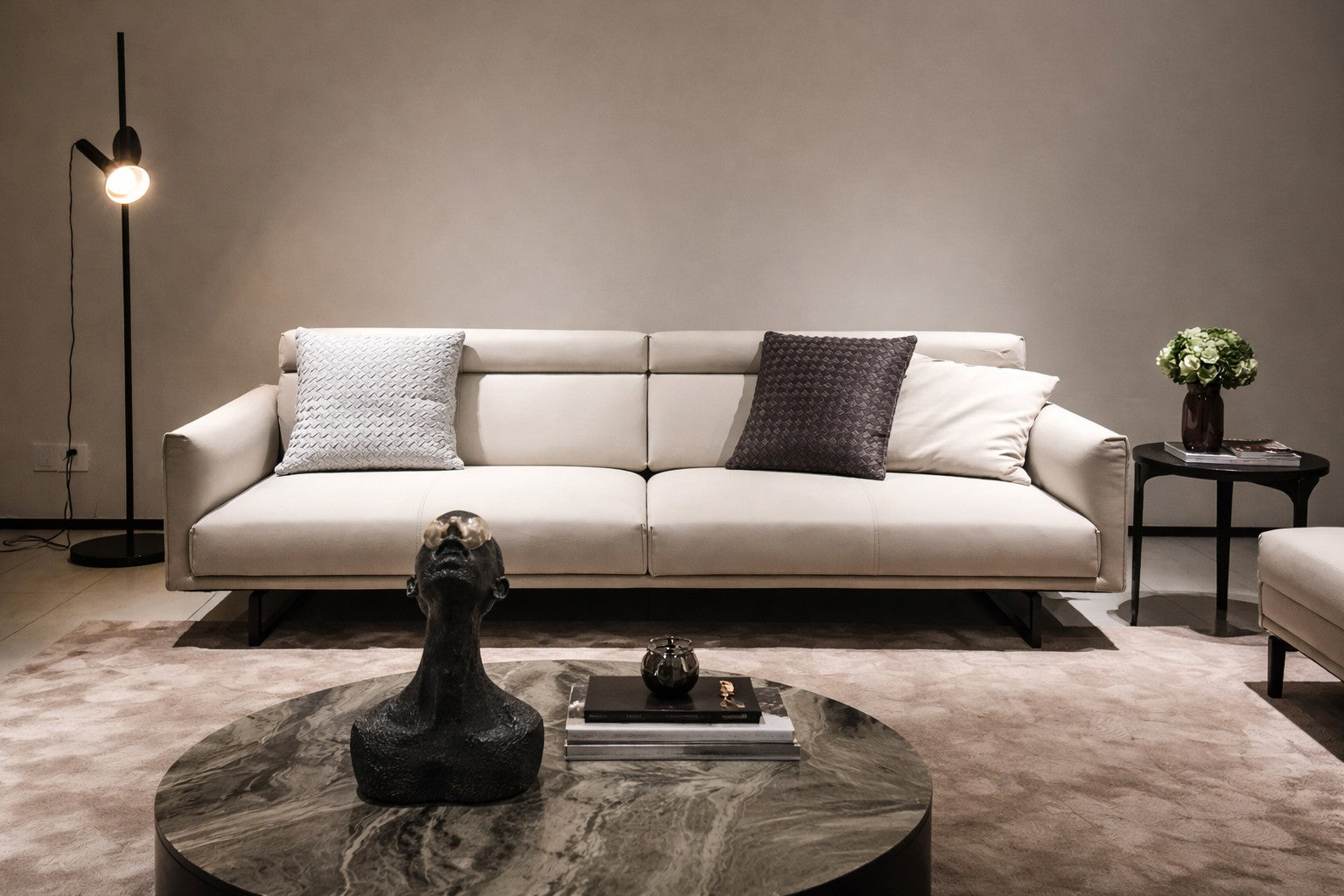The three seater Azur sofa was built for those cozy afternoons of private laughter and comforting talks. Its compact form is held together by a metal base and covered in thick feather down cushions for long hours of seating. Additionally, the slim armrests and high backrest introduce a delicate touch that is further complemented by the slim, tall legs holding the piece above ground. Nonetheless, the sofa's greatest asset is its sliding seat function that enhances your experience with extra room to lie down during movie nights or to take a refreshing nap.