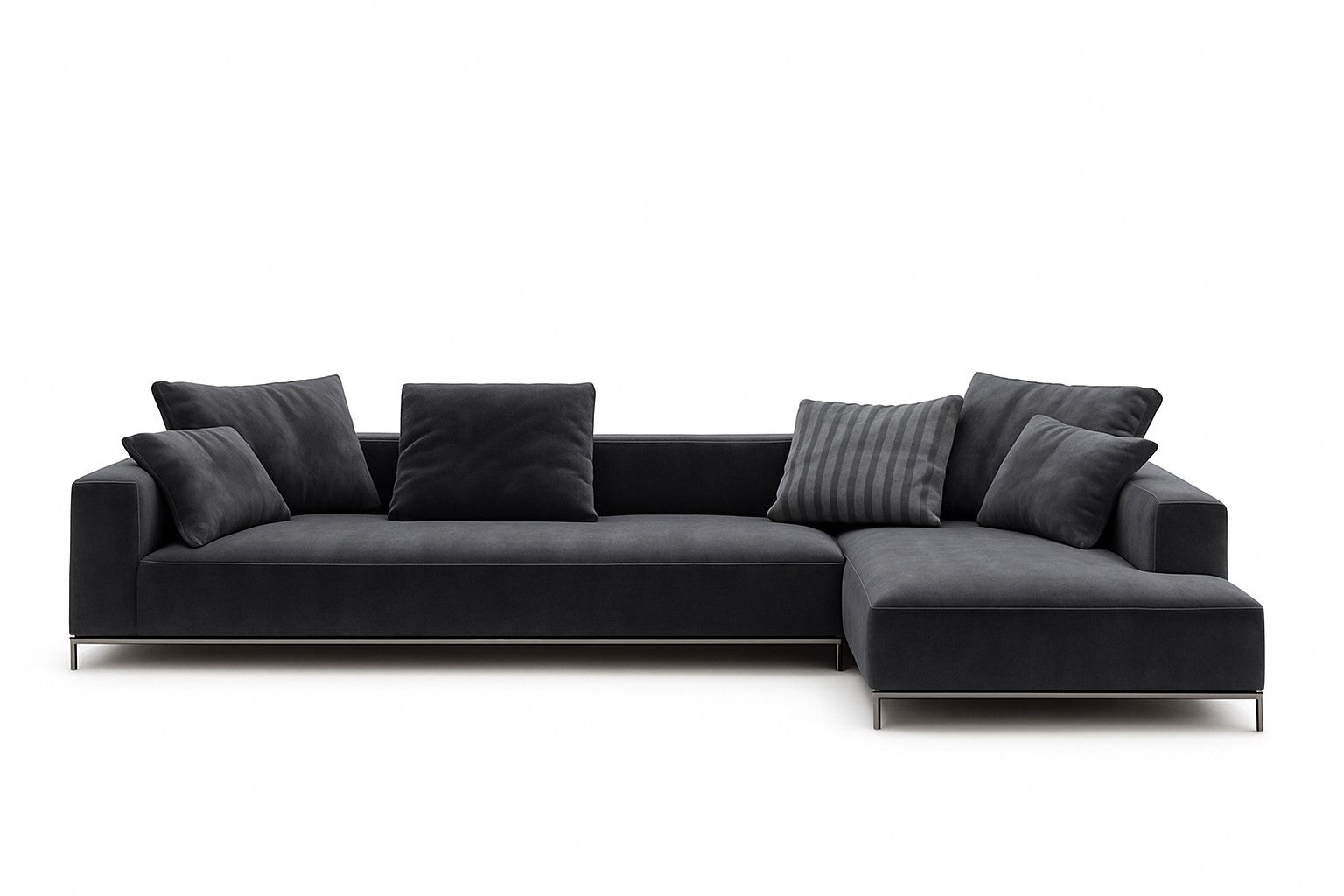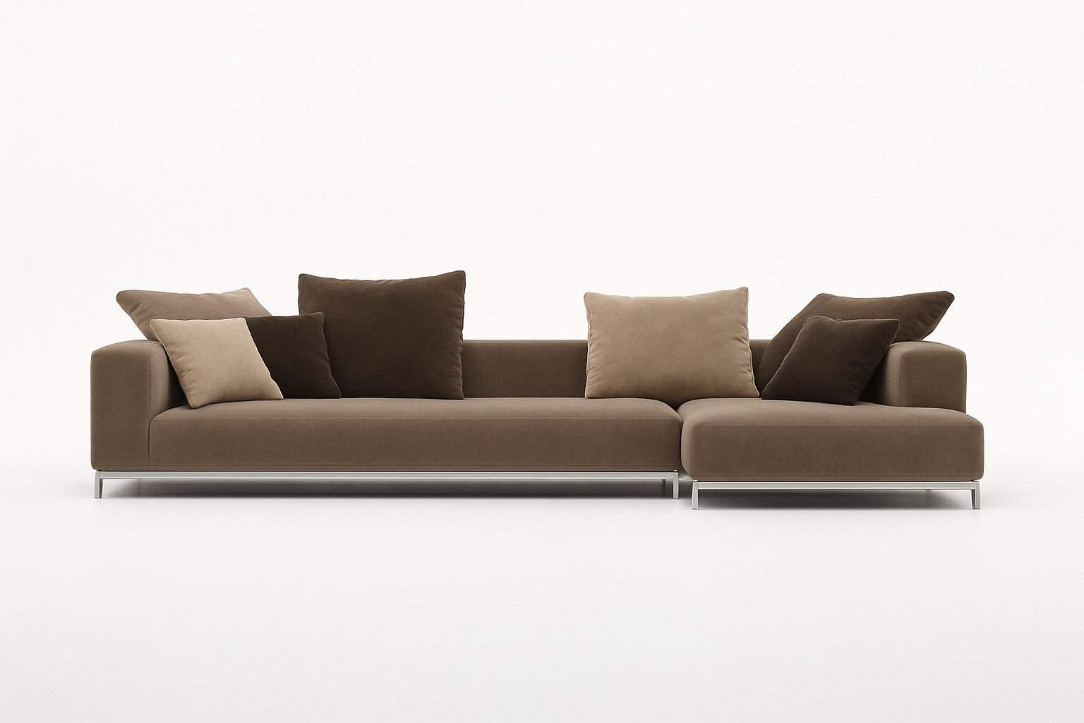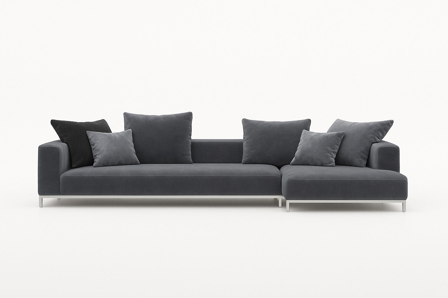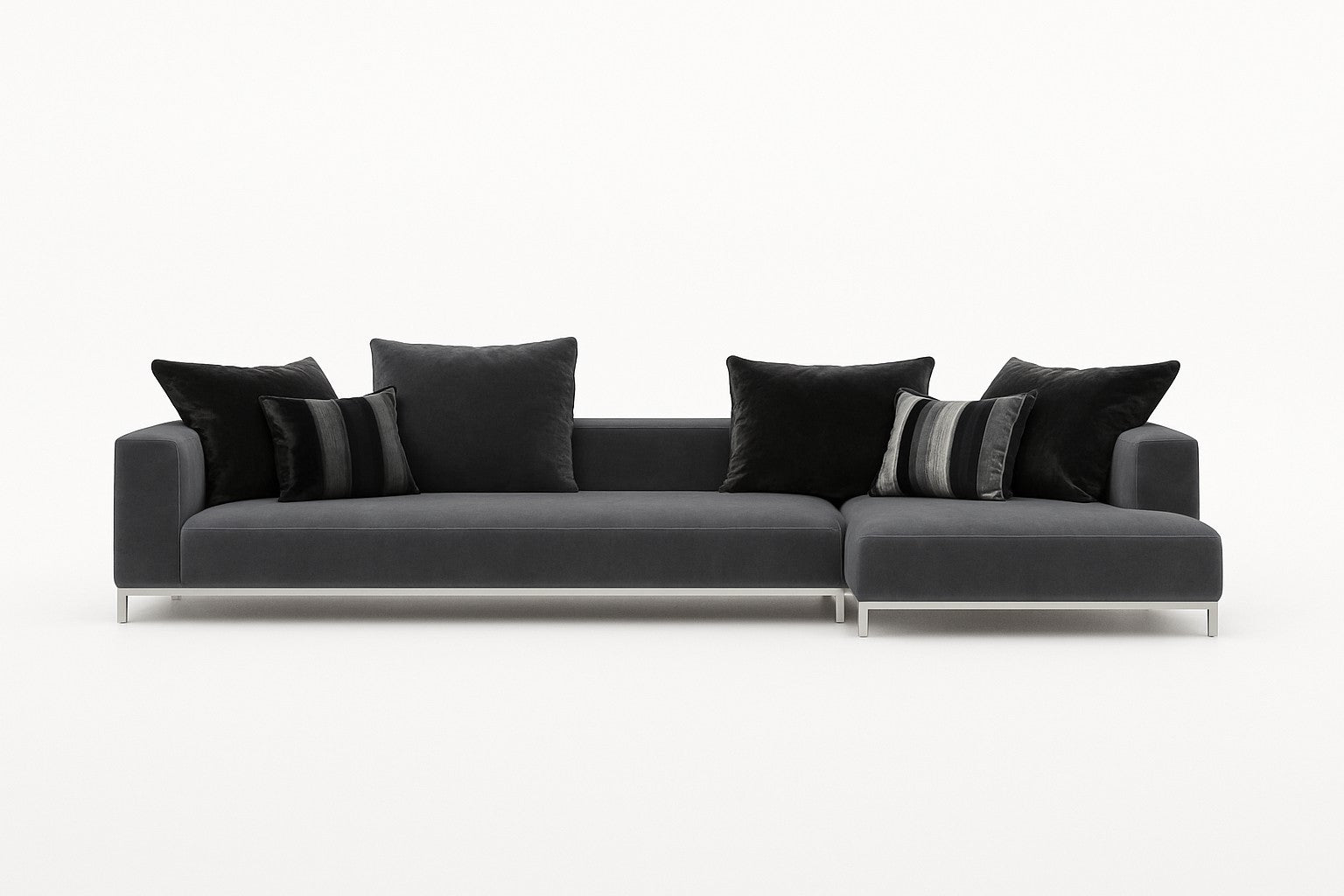 The Cielo Sectional embodies modern luxury through its sculptural proportions and refined materiality. Its architectural silhouette features broad, geometric arm panels, a low-profile backrest, and a right-facing chaise that extends the seating plane into a lounge-like expanse. Elevated on slim metallic legs, the frame appears to float, giving the piece a sense of visual lightness despite its substantial presence. The deep-seat configuration and structured cushioning combine for a design that feels simultaneously minimal, intentional, and indulgently comfortable.