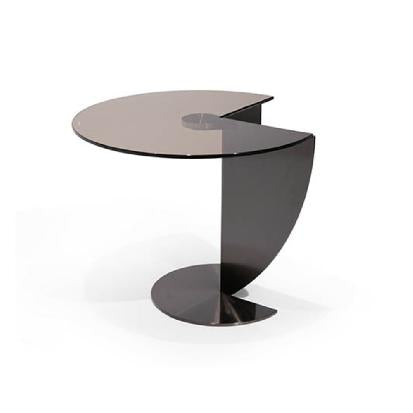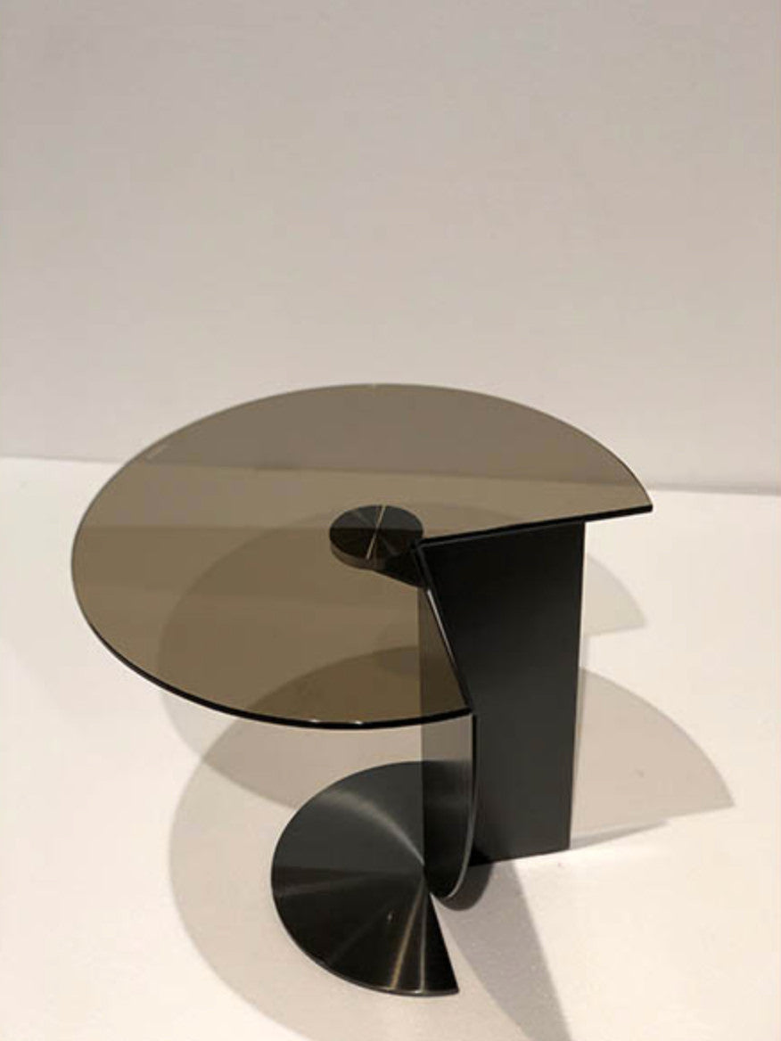 Both materials create a dynamic visual of light and shadows that is best exhibited in the pac-man shaped tabletop. At the same time the quarter circle delicate body that supports the design, adds a futuristic and contemporary aspect that intrigues us.