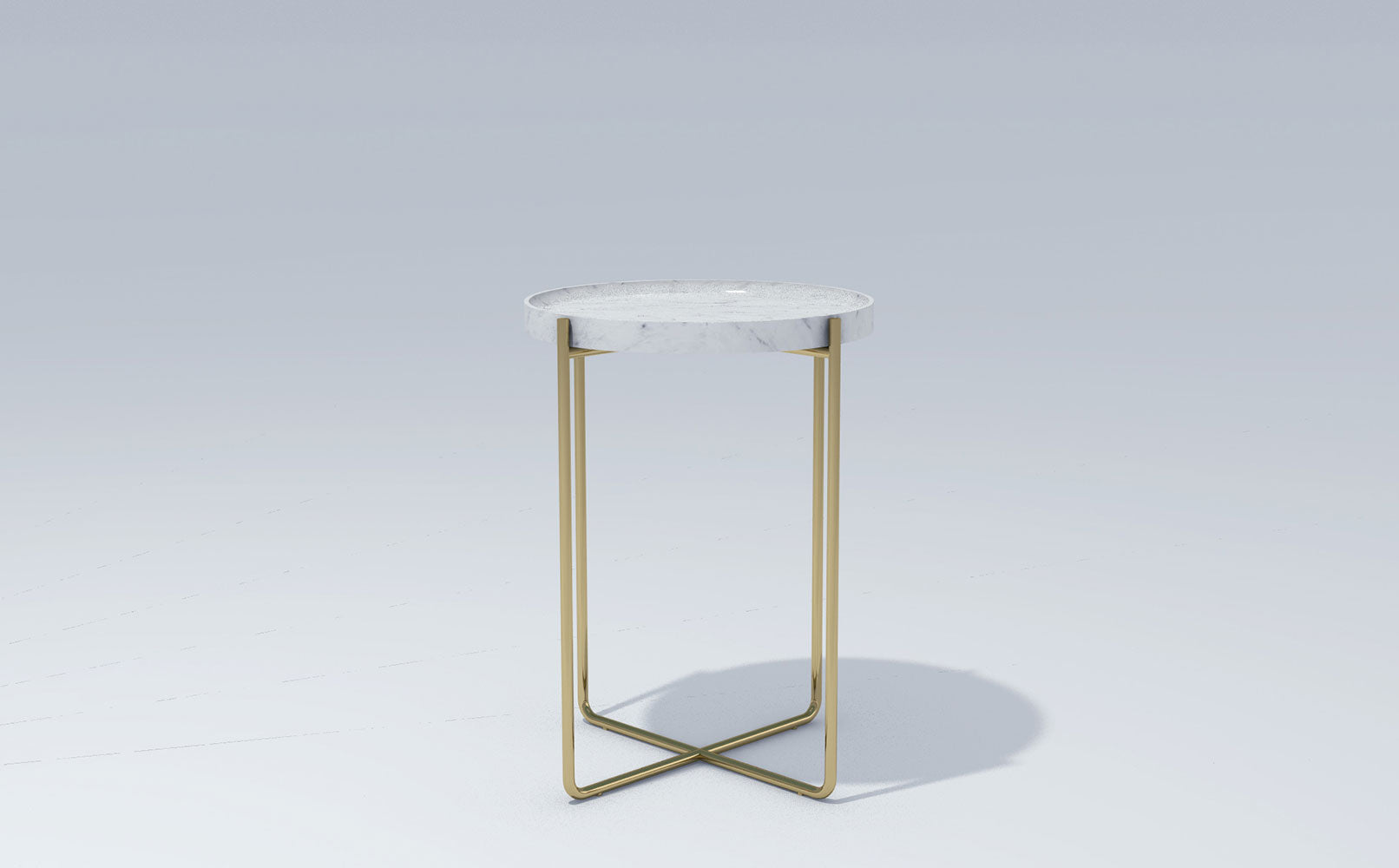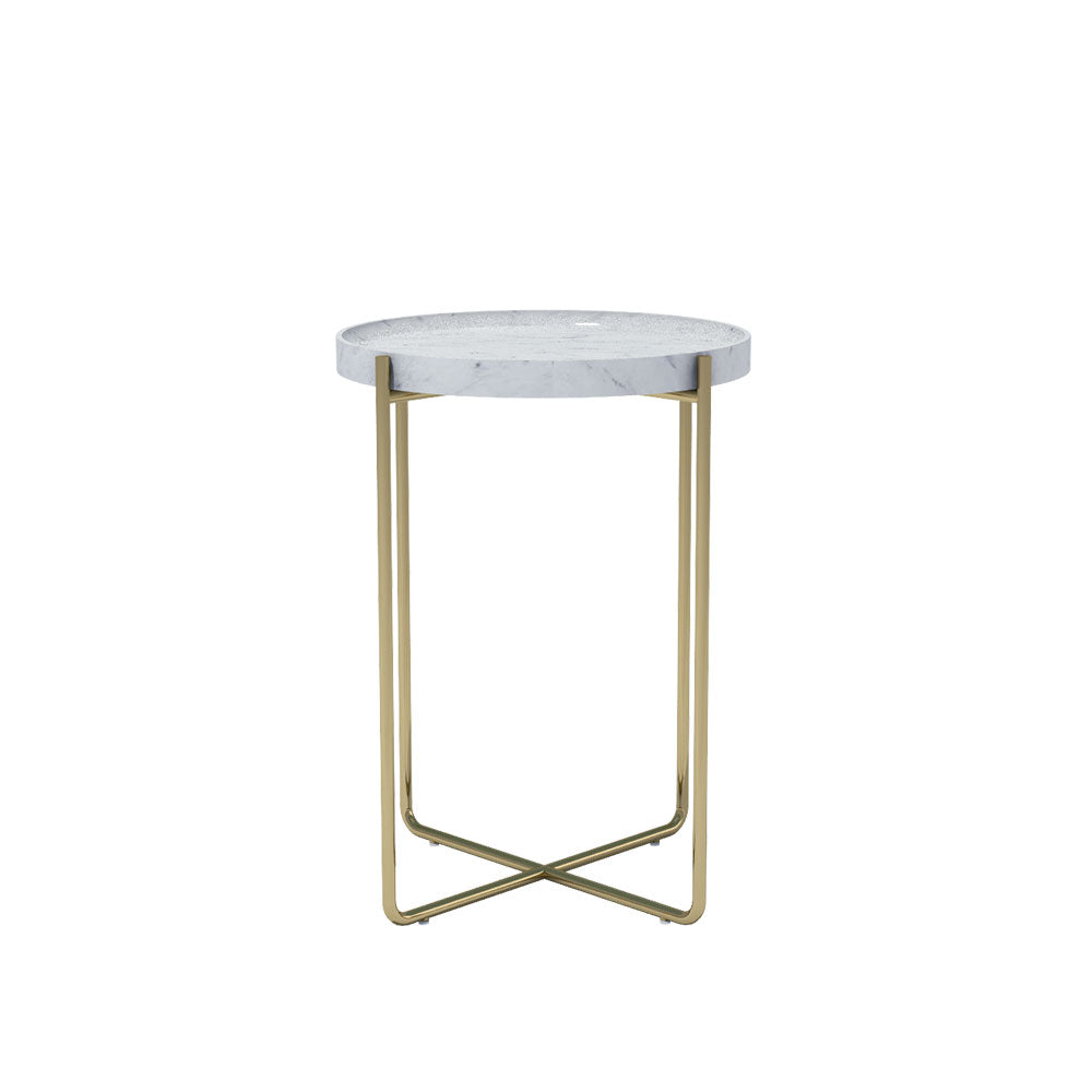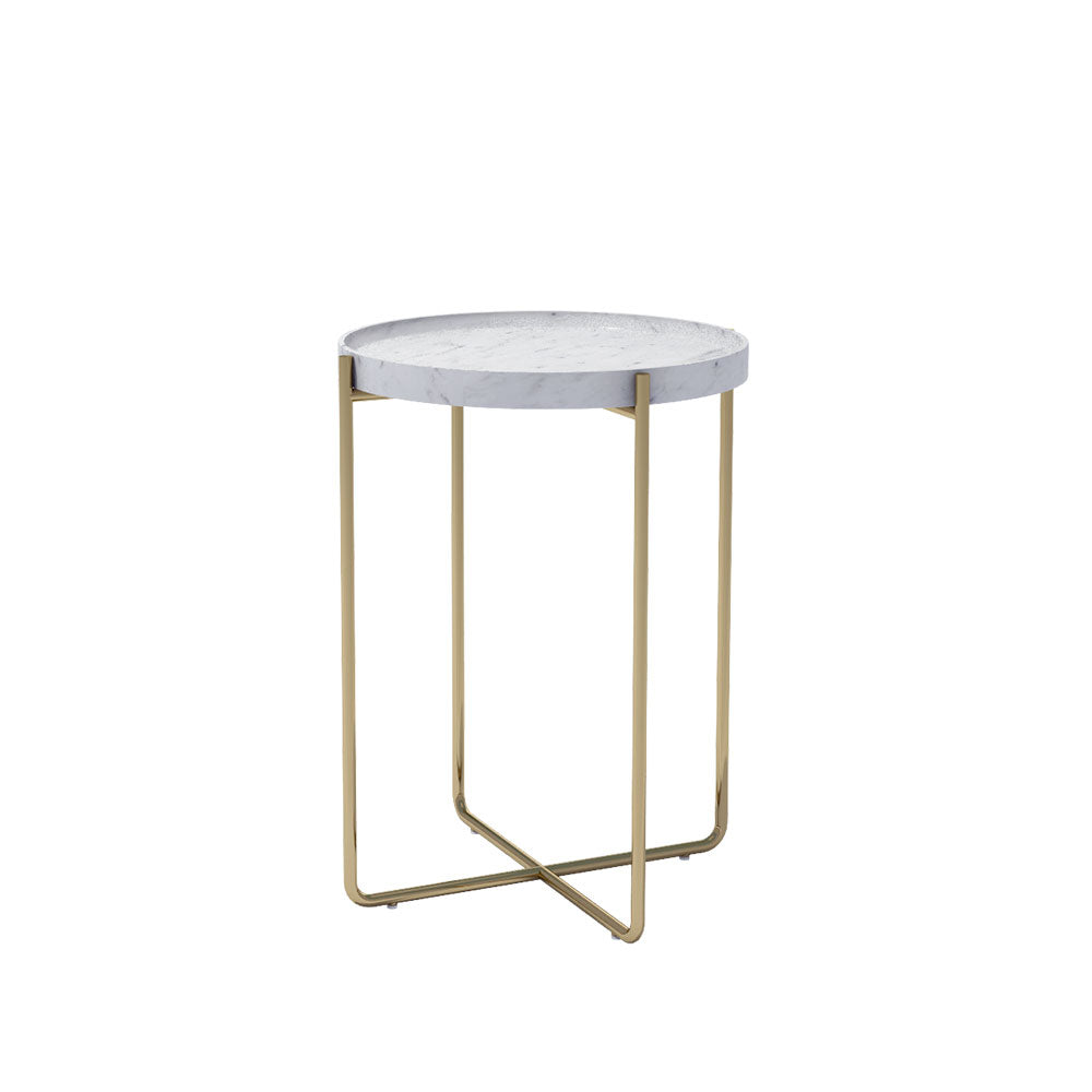 This marble top side table with gold legs is light and minimalistic. Without taking up too much floor space it adds a great deal of character to a room. The round stone top is lipped for functionality, but the slight rim also adds to the atheistic charm of the piece. Its four gold legs are nearly seamless as they cross at the floor and rise up to meet the stone top. Set beside your favorite chair or place a pair of them on each side of your living room couch for a touch of elegant charm.