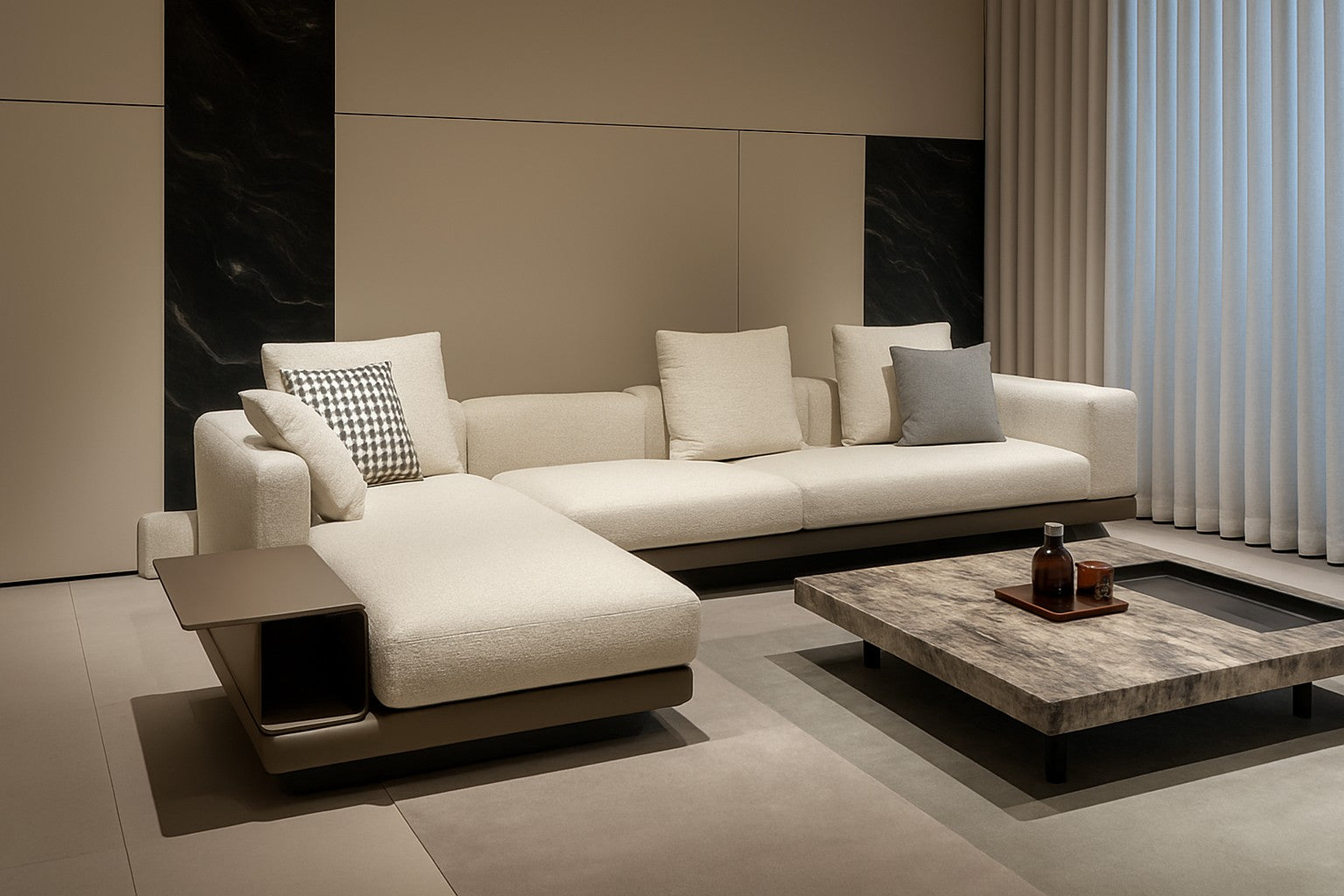 Balancing technical craftsmanship with modern glamour, the sectional integrates thoughtful details such as modular chaise extensions and cantilevered wood trays that function as built-in surfaces for books, drinks, or decorative accents. Loose back and accent pillows enhance comfort while allowing versatile styling, with contrasting rust-toned cushions adding a refined pop of color. Minimal seams, crisp tailoring, and the juxtaposition of warm wood finishes with understated neutral upholstery establish Fabienne as both a functional seating system and a striking centerpiece—perfect for interiors that demand presence, precision, and contemporary sophistication.