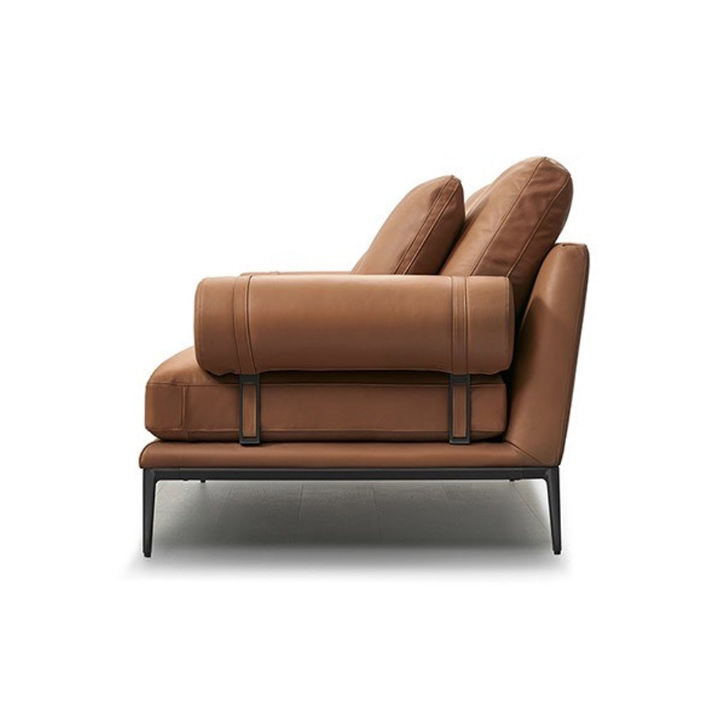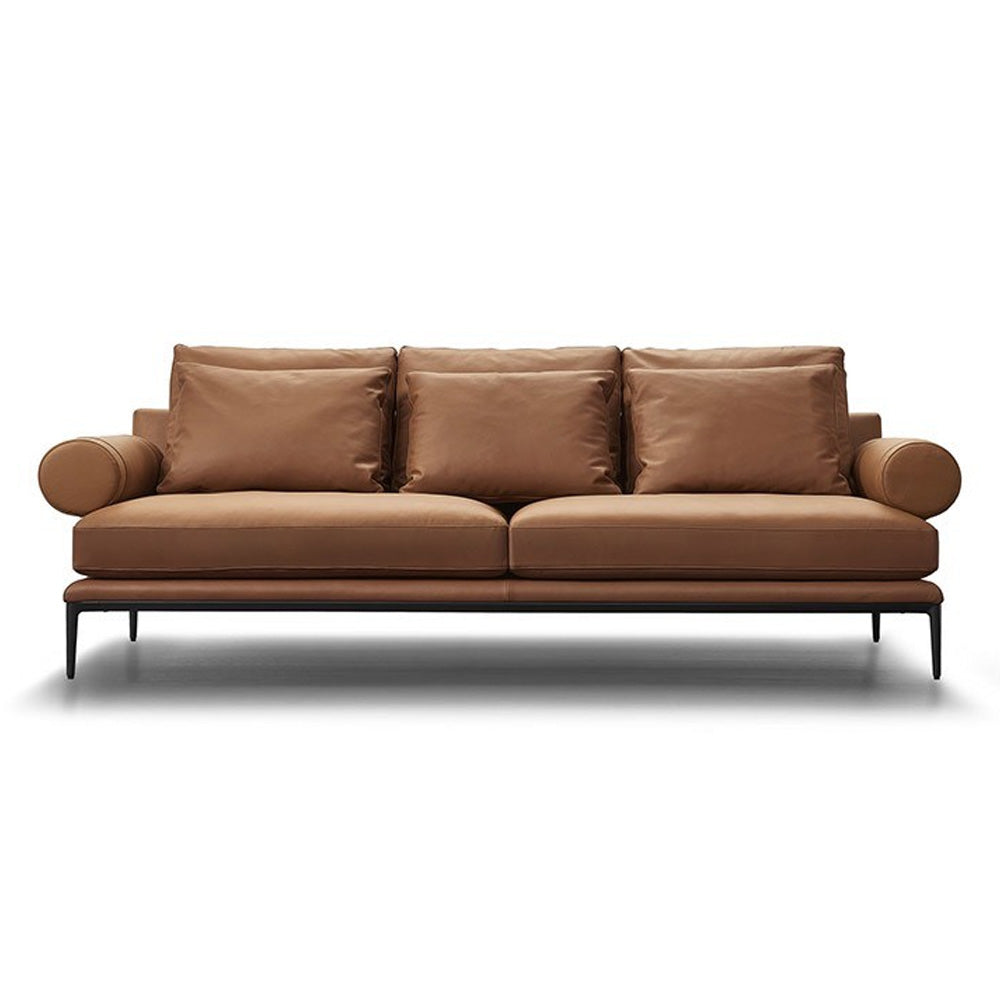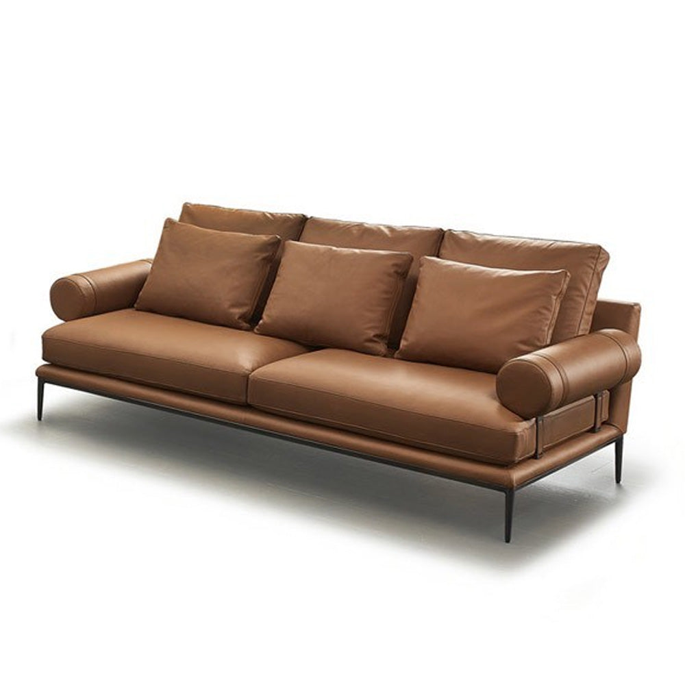 Mid-century modern charm proves its everlasting elegance and relevance for contemporary design as it returns to us in the form of the Gizel leather sofa. Its light brown surface endowed by subtle tones of orange, make this piece an immediate focal point. The classic backrest and seating design is enhanced by the quality grain leather and plush support for a better posture. Meanwhile, what stands out from this structure is the unusual cylindrical armrests that liberate space for a wider seating area while adding a touch of diversity to the sleek square forms of this design.