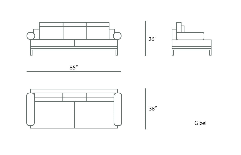 3 seater with 1 arm: L85" x W38" x H26" Chaise: L78" x W38" x H26"