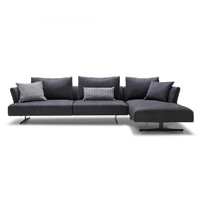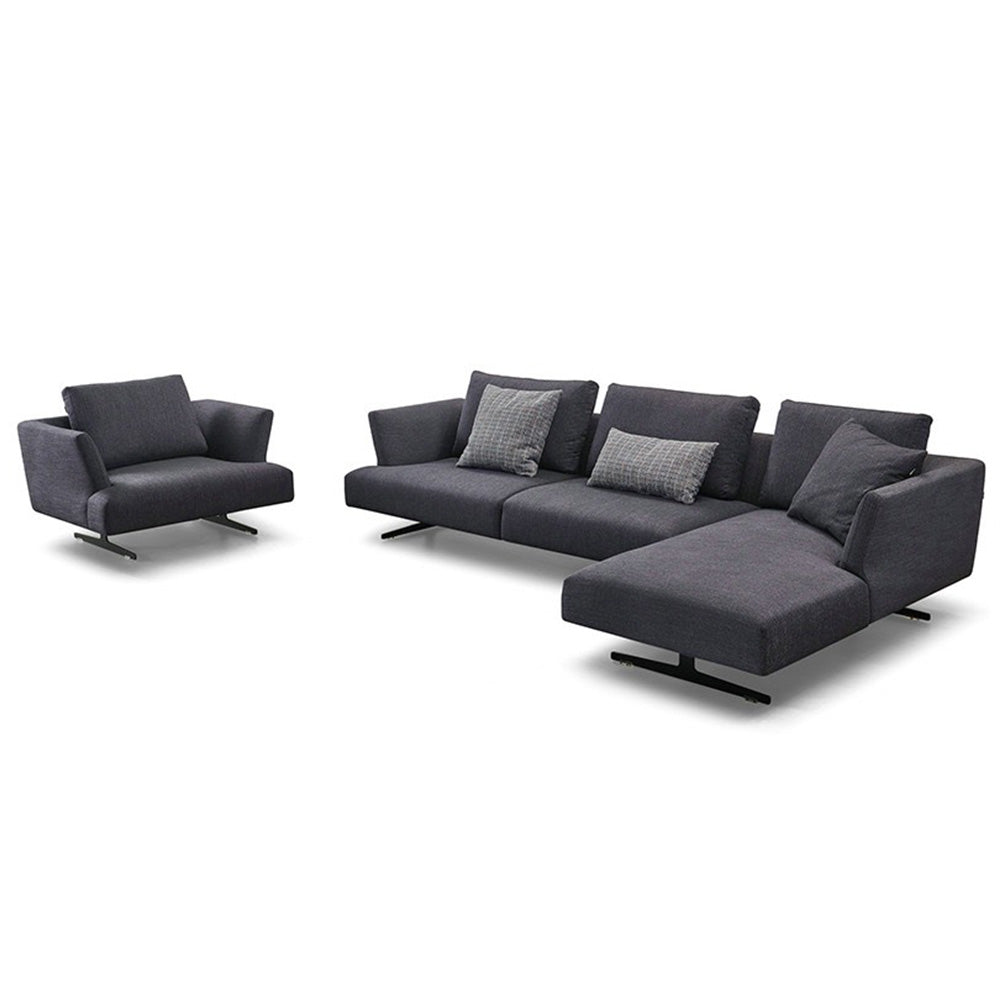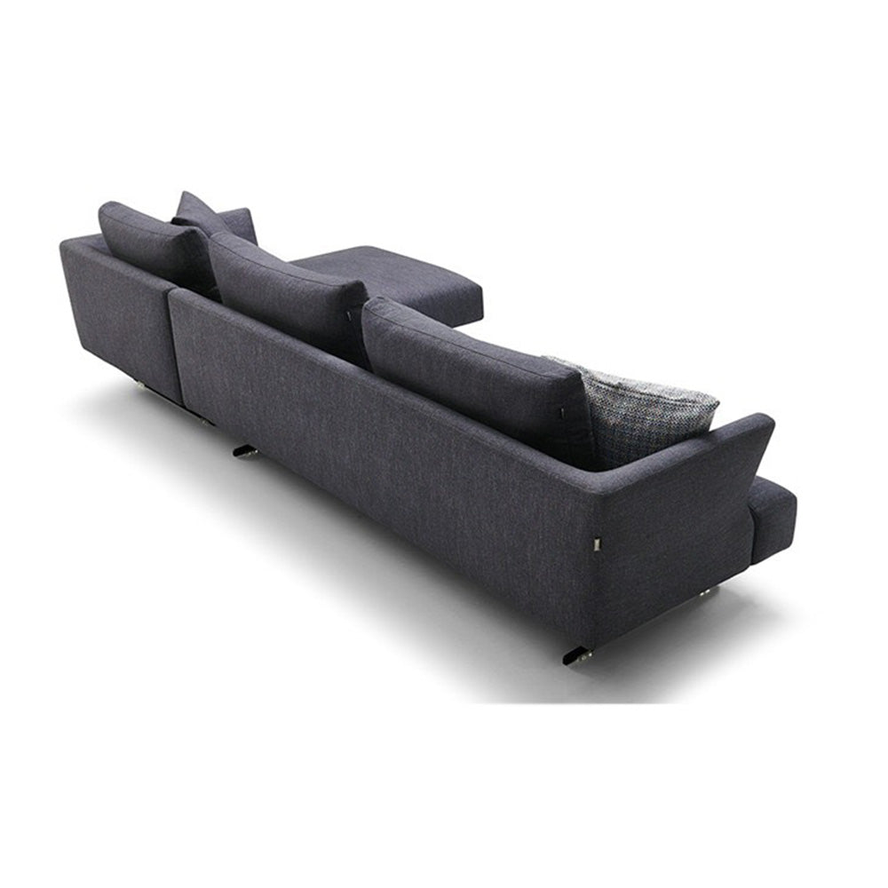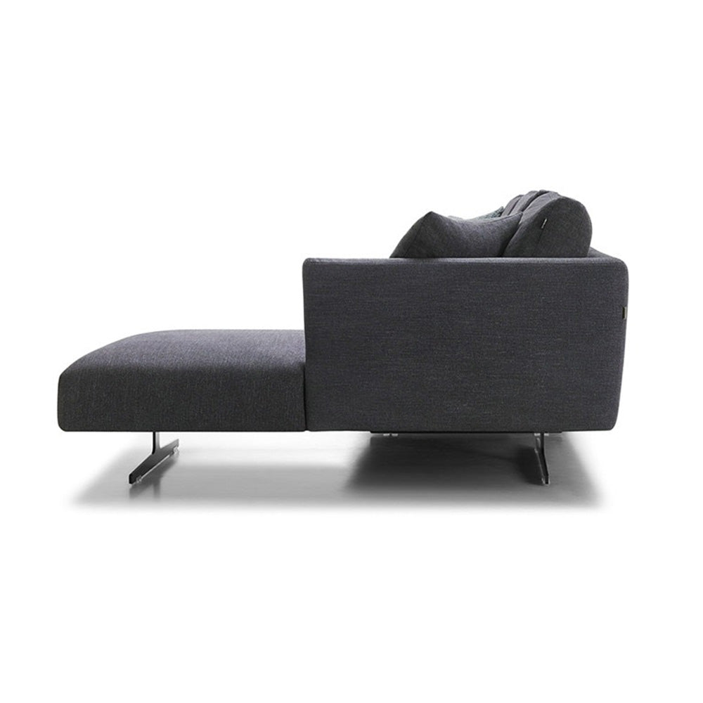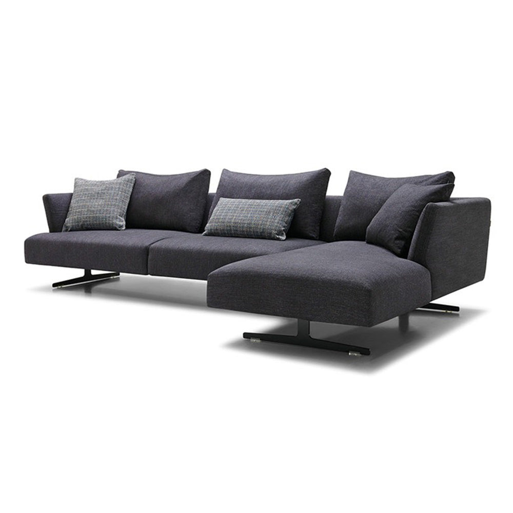 The design's slim, straight outline is based on sharp angles that are softened by the quality fabric and seating underlayers. Lastly, the industrial style metal legs give the sofa and chaise a few extra centimeters of height that create a sense of lightness and a chic urban look.