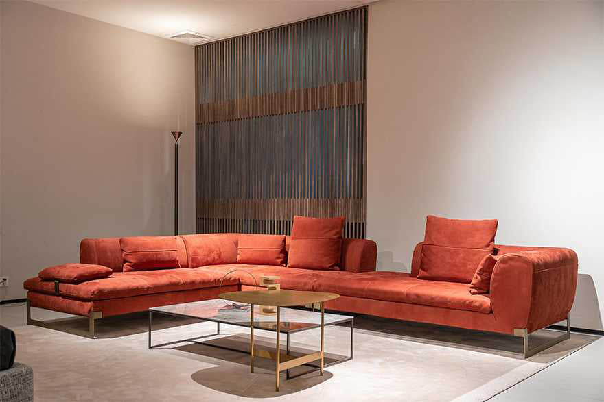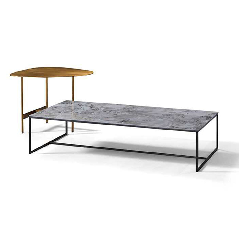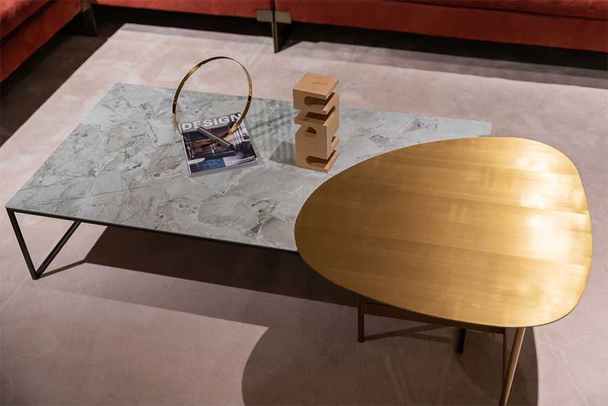 Just like the Earth's distinguishable layers, the Roma Designer Coffee Tables also showcase this uniqueness of individual forms coming together to achieve maximum efficiency. The end product consists of a low and extended table with a textured rock slab surface attached to a simple hardware bottom frame. On its own, this piece exudes an air of formality and straightforwardness that could blend into any minimalist or office design. However, when combined with the gold, stainless-steel triangular coffee table that looms over it, the design becomes a charismatic composition that attracts the spotlight effortlessly.