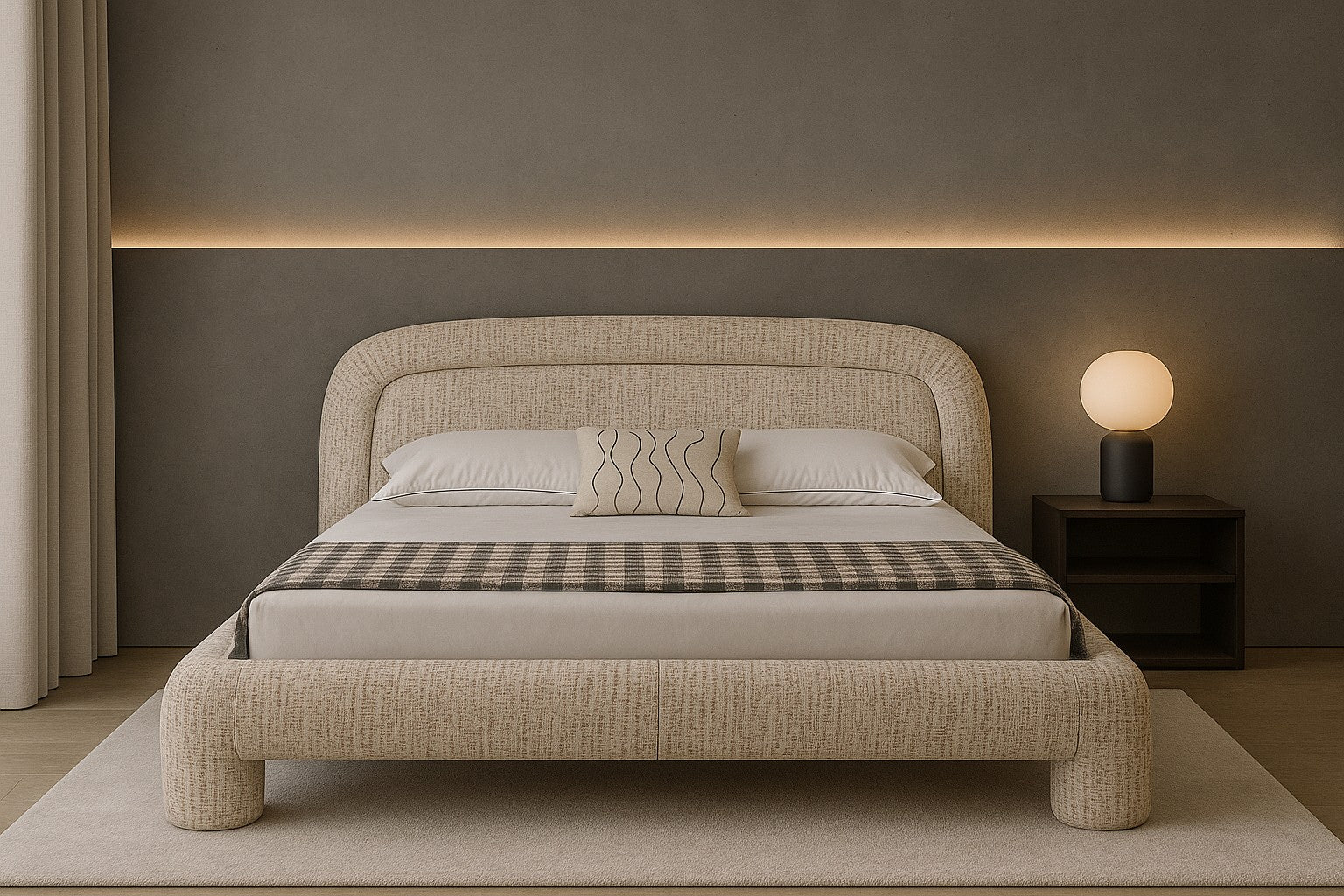 The bed is a masterful balance of couture-inspired detailing and technical precision. Its sculptural headboard, upholstered with meticulous tailoring, becomes both an architectural statement and a cocoon of comfort.