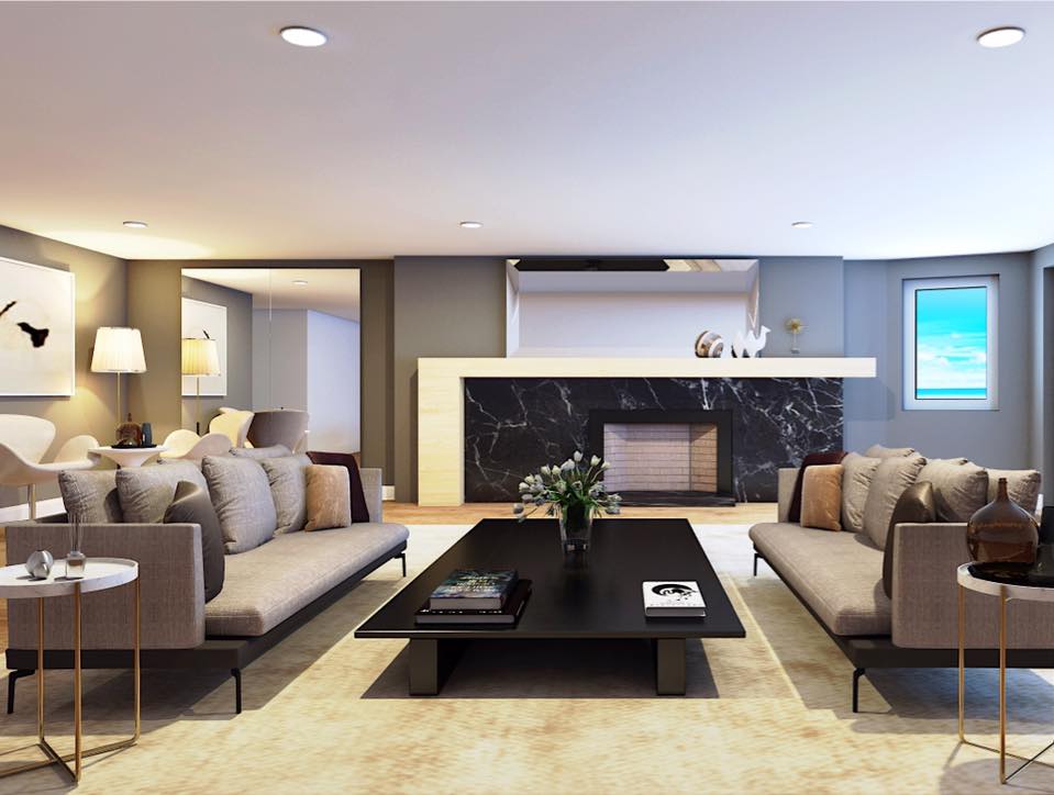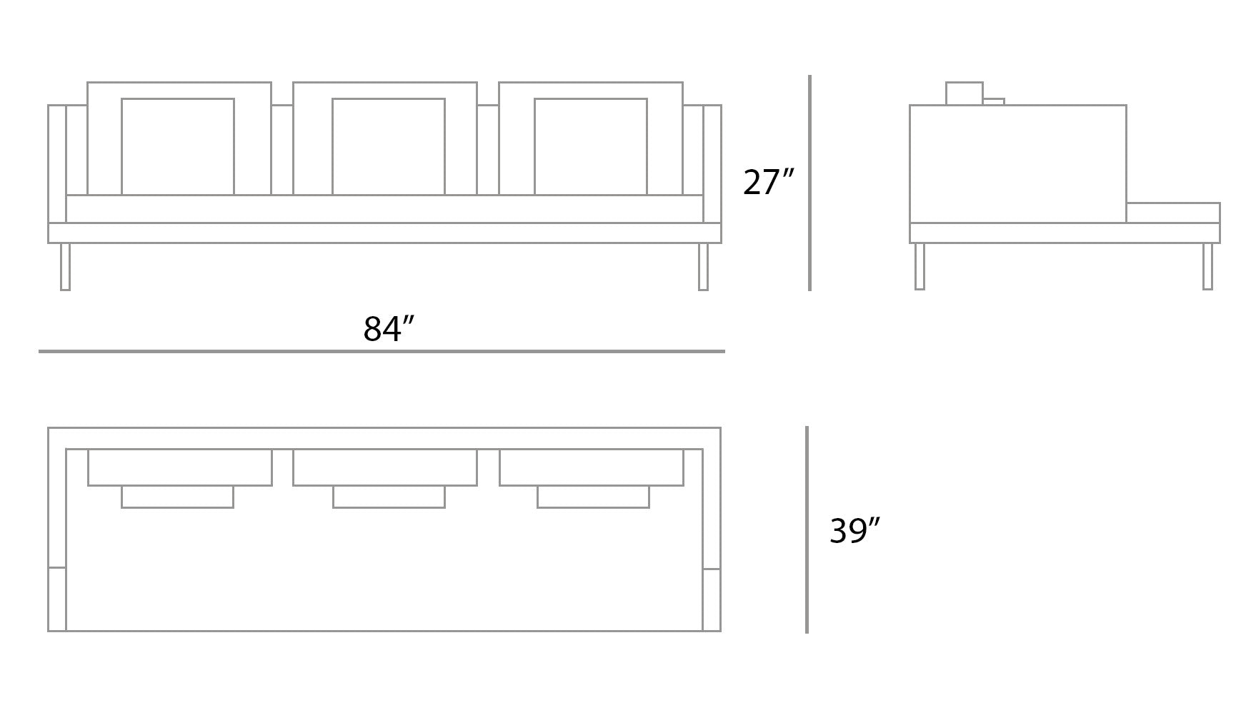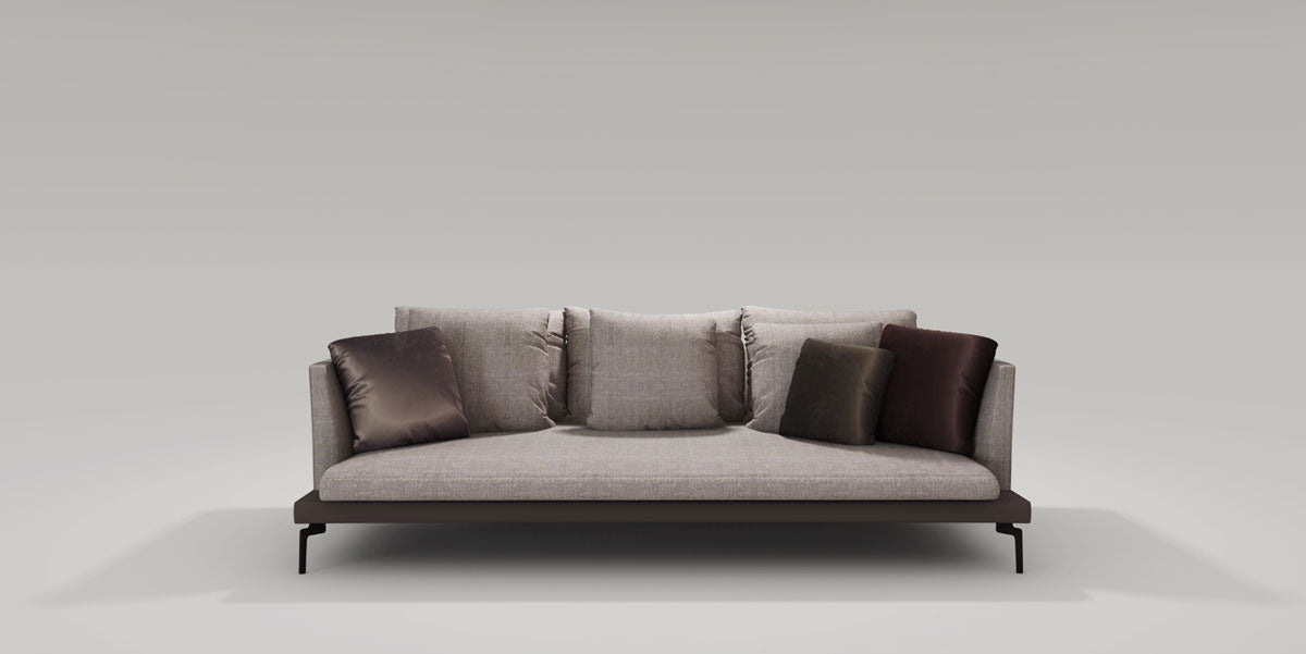 The black bold base is exposed and topped by contemporary seats cushions and seat back arms .The dynamic lines add to the smashing modern appeal. An array of pillows fill the sofa .clean minimalist look.Complete the room by adding side table and coffee tables.