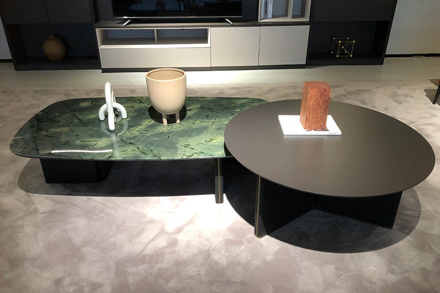 Moreover, each table complements the other thanks to the thematic colors of jade green marble and the dark brown metal base that seeps into the round table's top. As a single unit, this design creates a strong statement with a focus on balance and thoughtful combinations of modern elements.